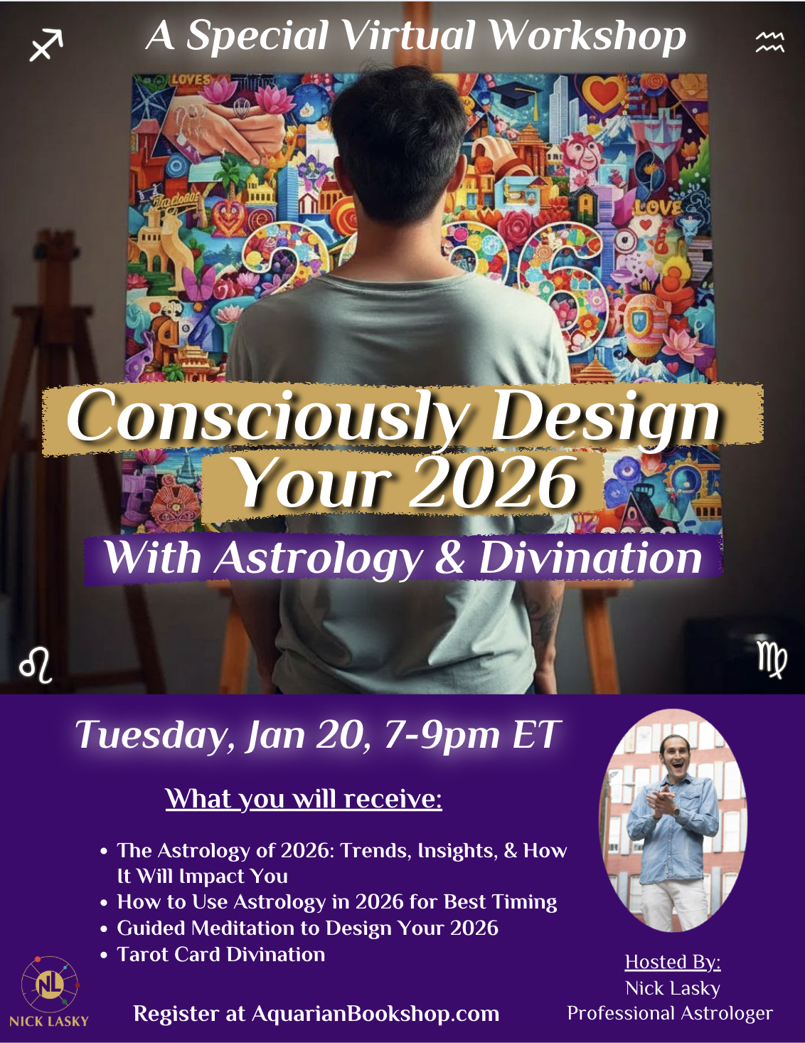 A live virtual workshop with astrologer Nick Lasky to map 2026 using astrology + divination for clarity, alignment, and co-creation.
